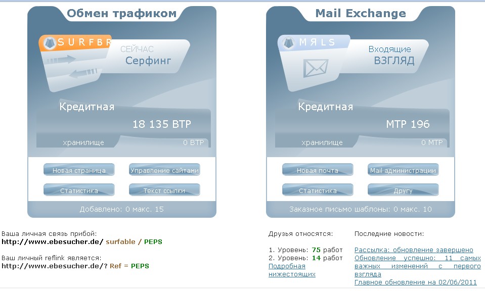 Увеличьте свой заработок, приглашая на автосерфинг своих друзей, от которых система будет Вам платить 8% их заработка. На сайте действует двухуровневая реферальная система, 8% от прямых рефералов и 5% от их рефералов, так что дерзайте, можно неплохо заработать. Свою рефссылку найдете на той же странице, где находится кнопка для запуска автосерфинга.
